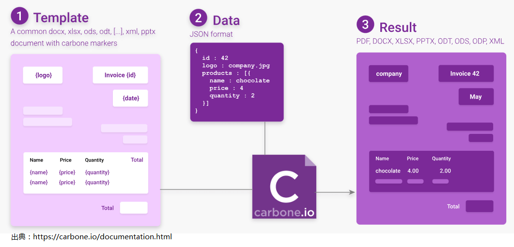 PDFの作成にはCarboneを使用します。 CarboneはMS WordやMS ExcelなどのテンプレートにJSONデータをバインドしてPDFを作成します。