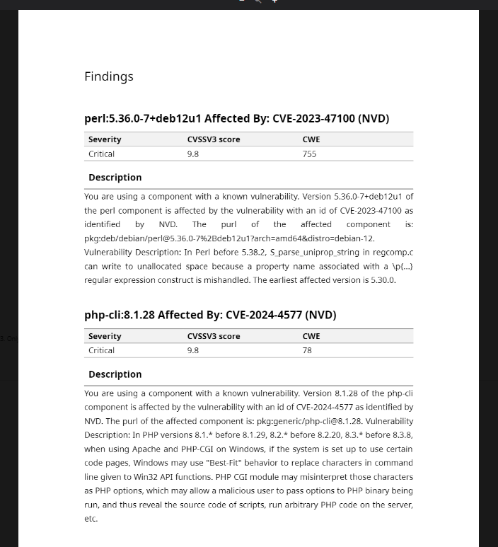 "description": "You are using a component with a known vulnerability. Version 5.36.0-7+deb12u1 of the perl component is affected by the vulnerability with an id of CVE-2023-47100...."