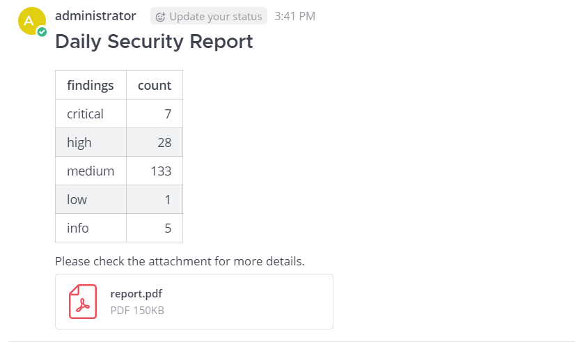 "message": "### Daily Security Report\n\n|findings|count|\n|:---|---:|\n|critical|{{ $('severity集計ノードの名前').first().json.severity_count.critical }}|\n|high|{{ $('severity集計ノードの名前').first().json.severity_count.high }}|\n|medium|{{ $('severity集計ノードの名前').first().json.severity_count.medium }}|\n|low|{{ $('severity集計ノードの名前').first().json.severity_count.low }}|\n|info|{{ $('severity集計ノードの名前').first().json.severity_count.info }}|\n\nPlease check the attachment for more details.",
