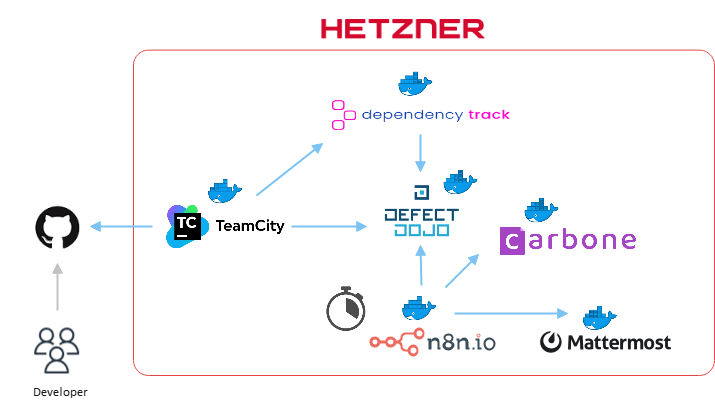 今回のシステム構成は下図のようになります。TeamCityがGitHubのリポジトリを監視し、リポジトリへのpushを検知したらCI/CDパイプラインを起動します。 TeamCityで実行されたセキュリティチェックの結果がDefectDojoに連携されます。 作成したSBOMはDependency-Trackにアップロードされ、Dependency-TrackからDefectDojoに脆弱性情報が連携されます。 n8nが日次でDefectDojoから脆弱性情報を取得し、carboneを使用してPDFレポートを作成し、MattermostにPDFを添付して送信します。