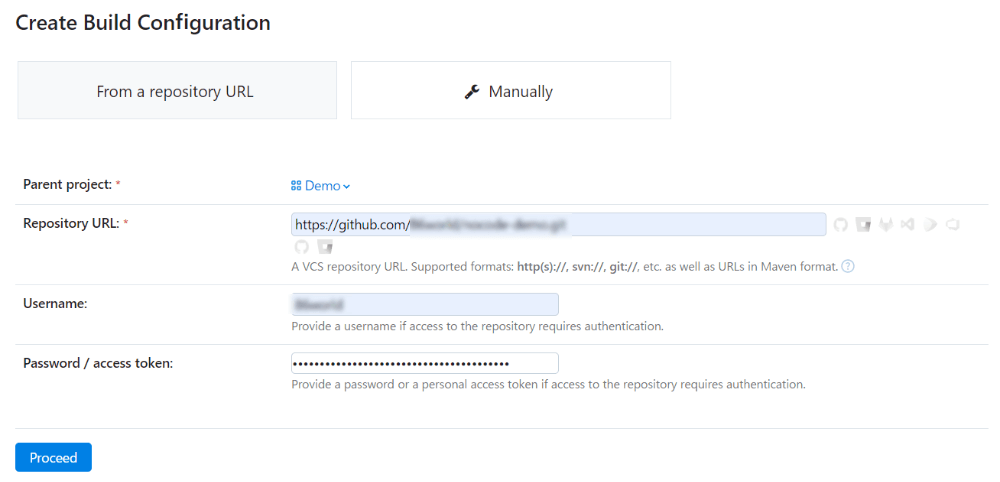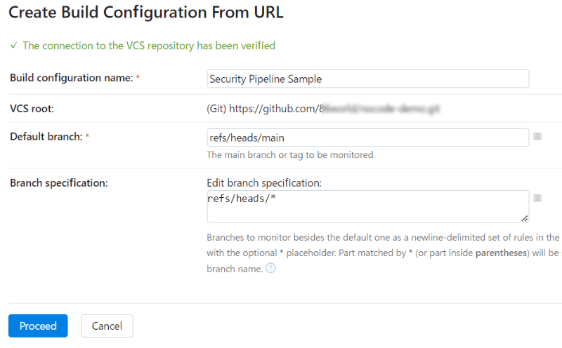 まずはビルドコンフィギュレーションの作成を行います。 作成画面で対象となるリポジトリのURLや監視するブランチなどを指定します。