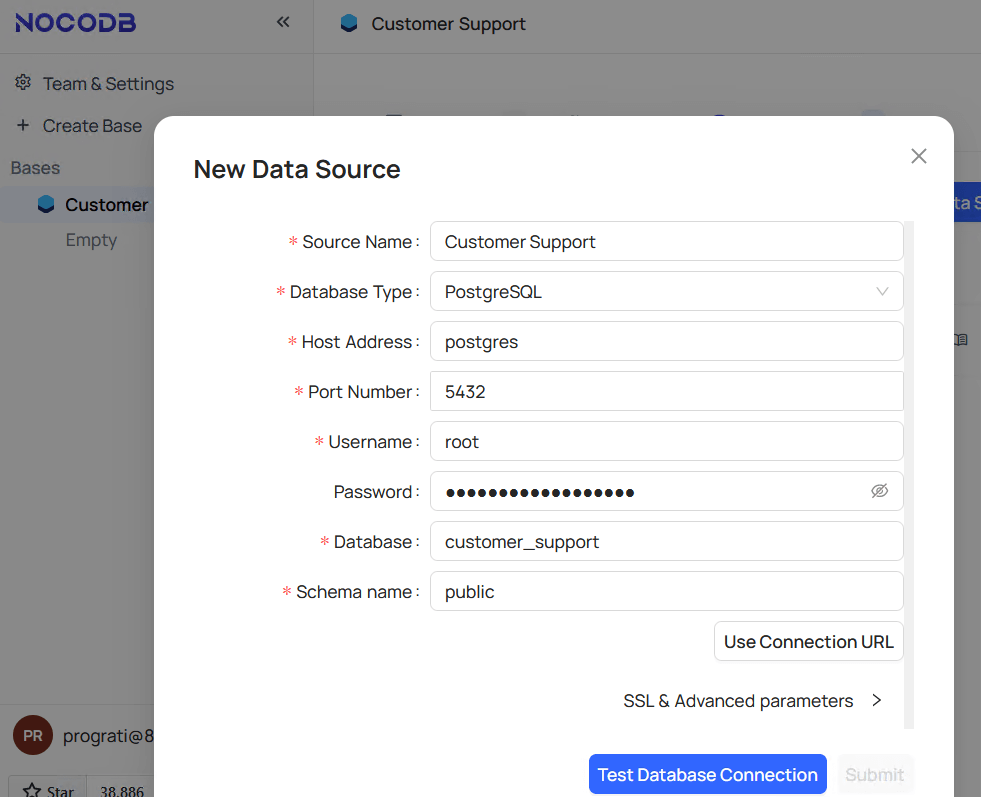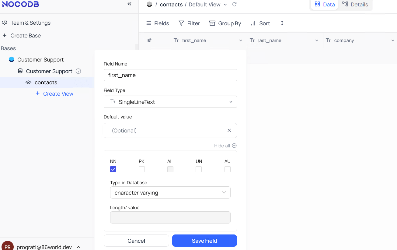 事前準備としてお問い合わせ内容を登録するテーブルをNocodbで作成します。 NocodbはNocodb自体が使用するデフォルトのDB以外に、外部のDB(MySQL、PostgreSQL...)と接続してデータを管理することが可能です。 今回はお問い合わせデータを他システムと共有して使用することを考慮して外部DB(PostgreSQL)と接続します。