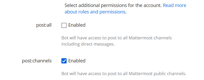 なお、ボットアカウントがチャネルに投稿できるようにpost:channelsの権限を付与する必要があります。