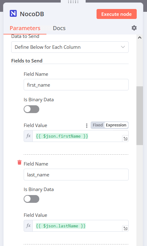 Fields to Send(NocoDBに送信するフィールド) の項目には以下のフィールドと値を追加します。 フィールド名はNocoDBで定義したフィールド名と一致させる必要があります。 フィールド値は前のノードから動的に値を取得しますのでFixedではなくExpressionを選択し式を入力します。 $jsonは$input.item.jsonのショートハンドで、現在のノードに対するJSONデータの入力を表す変数です。