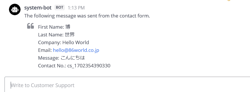 MattermostにアクセスするとBotアカウントからお問い合わせ内容が投稿されていることが確認できます。