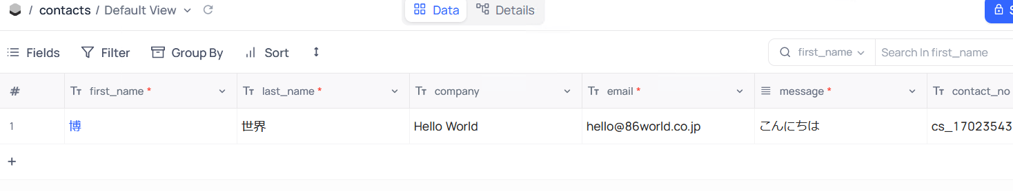 NocoDBにアクセスするとお問い合わせ内容が登録されていることが確認できます。