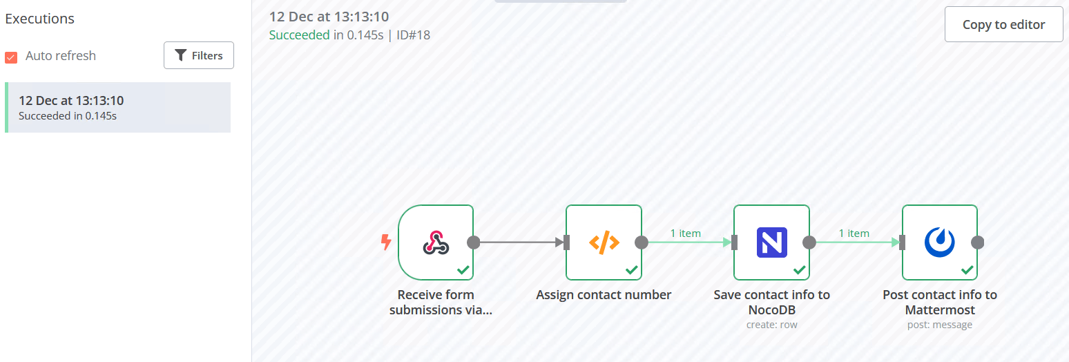 return contactsWebhookから出力されるデータは下記のようなJSONデータとなっており、上記コード内でお問い合わせ内容を抽出し、そこにお問い合わせ番号を割り当てて次のノードにデータを渡しています。 お問い合わせ番号はタイムスタンプの先頭にプリフィックスを付けた簡易的な文字列にしています。コード内で使用している$nowはビルトインの日付オブジェクトになります(参考:Built-in date and time methods)。