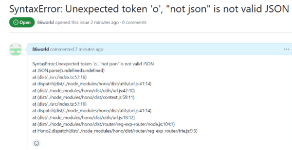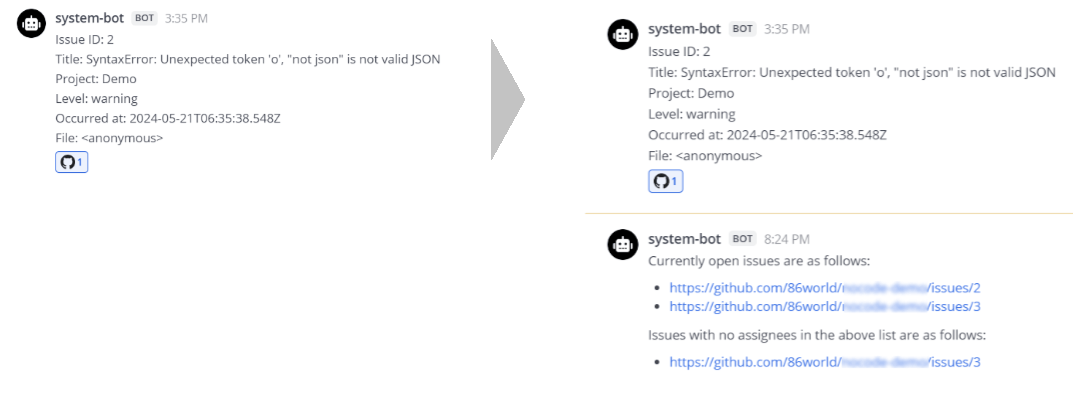 では、GitHubにIssueを登録してみます。リアクションを付けるとワークフロエンジンンにIssue登録イベントが送信され、Issue登録後にIssue同期ジョブが起動します。しばらく待つとオープン中のIssueが通知されます。