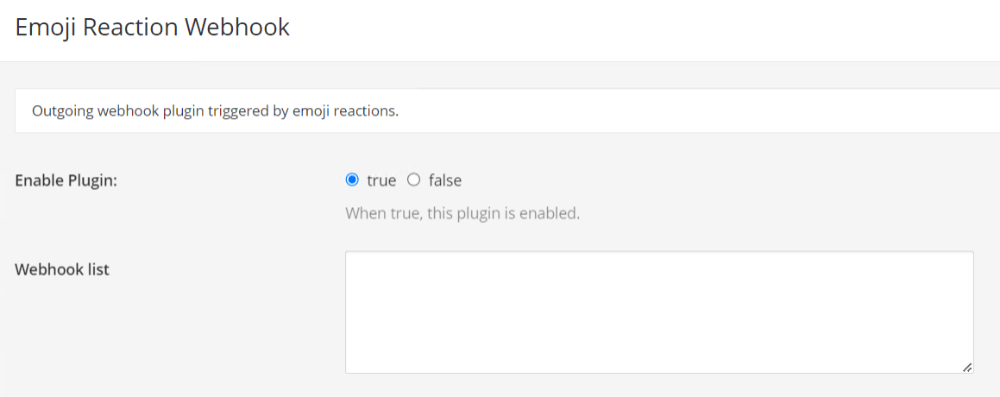 }今回はWebhookListという複数行テキストの項目を追加して、そこにWebhookの設定をJSON形式で入力して行うようにします。 次にserver/plugin.goファイルにemojiのリアクションが付けられた時の処理を実装します。