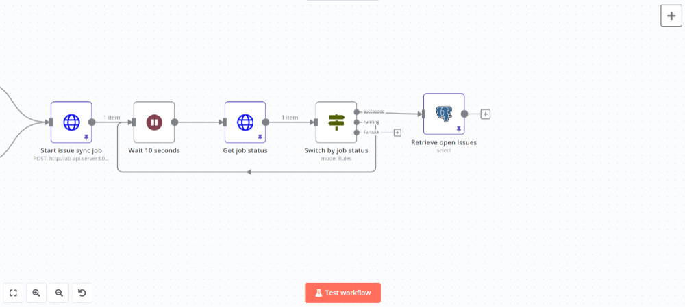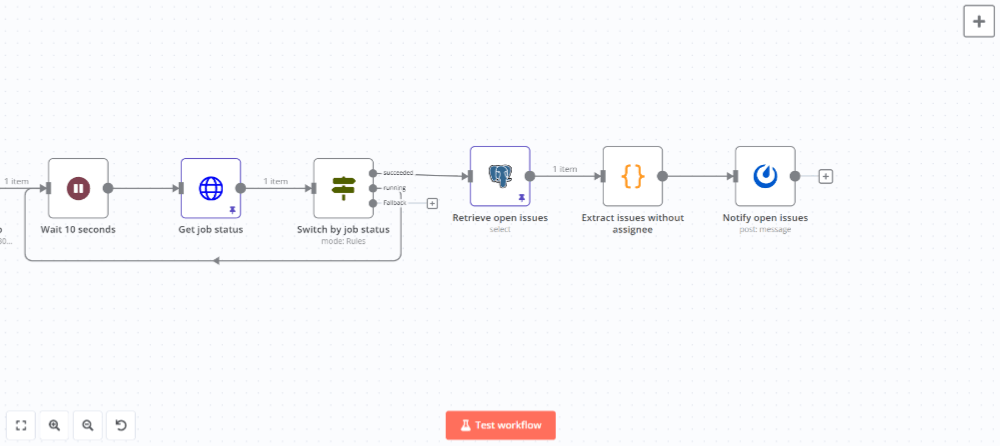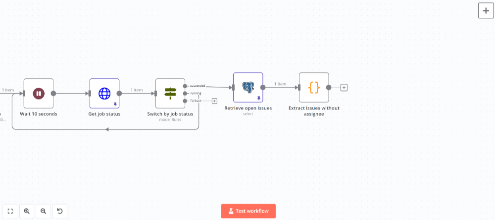 runningブランチをWaitノードに接続してステータスがrunningの場合はステータス監視を繰り返すようにします。 succeededブランチにPostgresノードを追加して同期テーブルからオープン中のIssueを取得します。