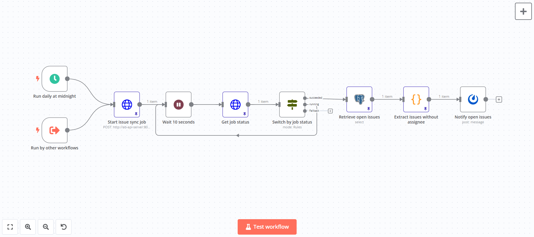 return { open, noAssignee }Mattermostノードを追加してオープン中のIssueおよび担当者がアサインされていないIssueを通知します。
