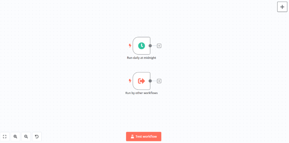 まずはワークフローをスケジュール起動するためのScheduleノード(ノードパネルからOn a scheduleを選択)とWorkflowノード(ノードパネルからWhen called by another workflowを選択)を追加します。